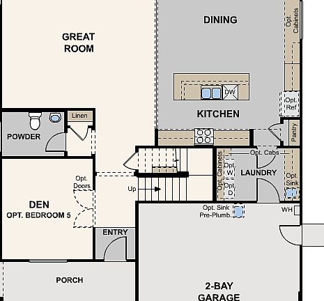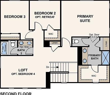 The Auburn offers versatility and is great for those who love to entertain. The spacious kitchen offers an abundance of cabinetry and a large island for additional prep space. Take full advantage of the natural light coming through the dining room from the sliding glass door. The flow of the kitchen, dining room, and great room allows entertaining to be a breeze. The den located at the front of the home overlooks the porch and front yard. A spacious powder bath and linen closet are also located downstairs. Upstairs, a bright and open loft looks onto the front yard. A full hall bath serves the upstairs bedrooms and a linen closet provides extra storage. The Primary Suite, tucked at the rear of the home, feels like a retreat with its private views of the backyard. The en-suite bath boasts ample storage via the extra linen and spacious walk-in closet.3 Bedrooms / 2.5 Baths / Den / Loft / 2-Bay GarageOpt. 3-Bay GarageOpt. Covered PatioOpt. Bedroom 5 / Bath 3 at DenOpt. Bedroom 4 at LoftOpt. Primary Suite Retreat at Bedroom 2Opt. Bathtub at Primary Suite Bath