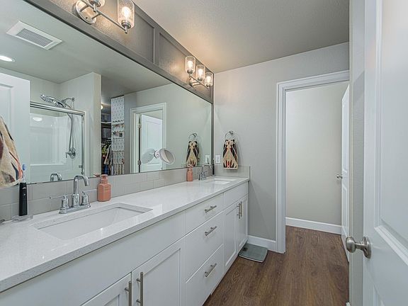 countertops, generous cabinetry, a convenient pantry, and a large island perfect for entertaining. Bathrooms are finished with matching quartz countertops for a cohesive,