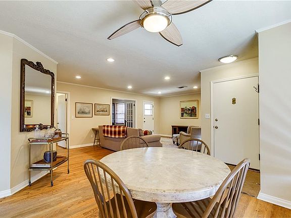 Douglas Park just steps away! Nice one level with original hardwood floors and open layout. Great floor plan with spacious living and dining areas adjoining one another. Kitchen with stainless appliances, granite countertops, and moveable bar in breakfast area that can also serve as an island. Primary bedroom accommodates a king bed and has double closets. The primary bedroom also features an ensuite bath with vintage tile and great storage. Two additional bedrooms are well appointed and one is currently being used as a second living area and library. Hall bath also features vintage neutral tile and shower. Backyard is great for entertaining and has large open stone patio. Two car detached garage being sold in as-is condition but functioning. Wonderful home in great location close to shopping, dining and entertainment. You will not want to miss this one!