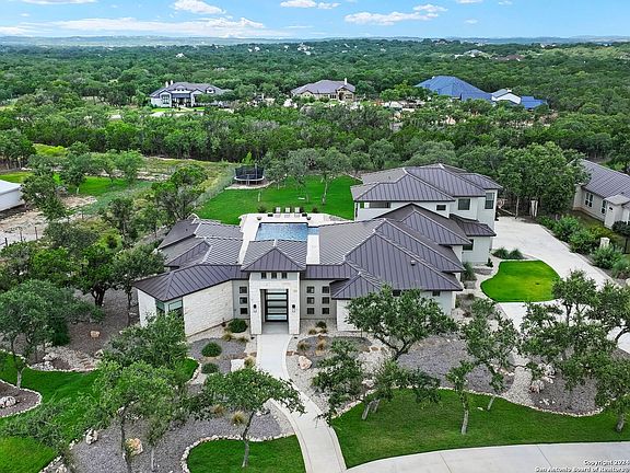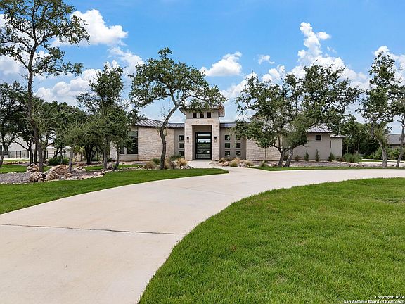 Perfectly designed for the discerning buyer who demands excellence, architectural intrigue, and privacy on a sprawling 1.19-acre lot. This home blends contemporary aesthetics with comfort and practicality seamlessly. Every detail, from designer-selected finishes to custom architectural elements, transforms this residence into a sophisticated showcase. The indoor and outdoor living spaces harmonize effortlessly, with expansive picture windows that reveal the outdoor kitchen, heated pool, and spa. The kitchen features top-of-the-line professional appliances, a gas range, quartz countertops, custom cabinets, a sizable waterfall island, and a custom pantry-a culinary enthusiast's dream. A serene study offers tranquility with scenic views. The primary retreat with outdoor access boasts a bathroom reminiscent of a 5-star resort, featuring a freestanding spa soaking tub, walk-in shower, and an expansive custom walk-in closet with dual vanity areas. Entertainment options abound with a media room leading to the pool, perfect for hosting guests. A downstairs secondary bedroom with an ensuite bath provides comfort and privacy for visitors. Upstairs, an additional game room accompanies three oversized bedrooms, each with its own bath. Additional highlights include an oversized three-car garage and professionally landscaped exteriors that encapsulate the quintessential Texas Hill Country lifestyle. Two 500-gallon propane tanks.