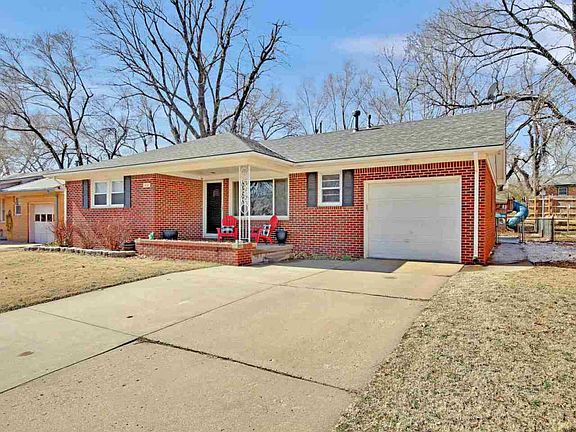Cute! Cute! Cute! Check out this darling all brick 3 bedroom, 1 bath ranch in Derby! Living romm, dining room, eating space in kitchen, and a large family room with wood burning fireplace. Beautiful wood floors and luxury vinyl tile. Outside this home has a covered front porch and a large covered patio area in the backyard for outdoor entertaining. And the playset stays! Move in ready! Don't miss this one!