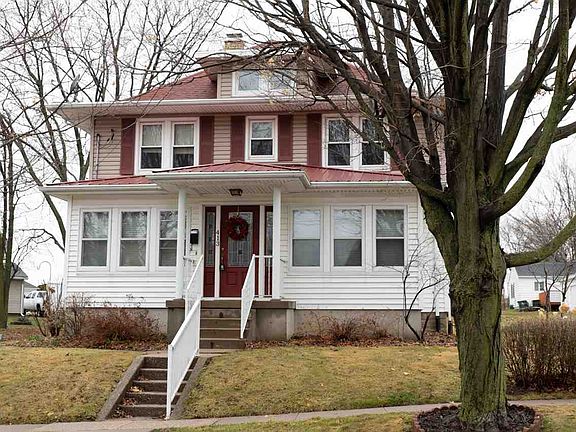 Check out this beautiful, well-maintained, 4-bedroom, 2-bathroom home! Original hardwood floors, updated kitchen, new carpeting, main level laundry and full bath with updated shower complete with an attached 2.5 car garage all at an affordable price. Enjoy the natural light all year long in the 4-season front porch. Spacious living room is connected to a formal dining room via beautiful, original glass French doors. 4 bedrooms and a full bathroom upstairs. One bedroom has access to a balcony on the west elevation. Established neighborhood with mature trees within walking distance to the square. Welcome home!