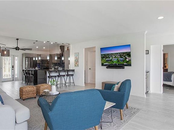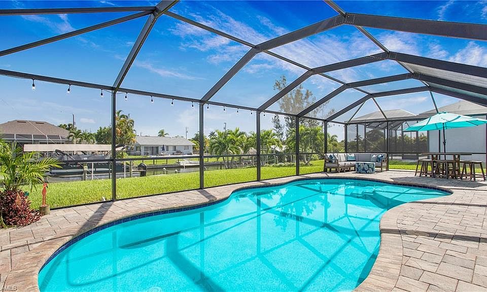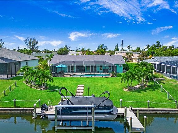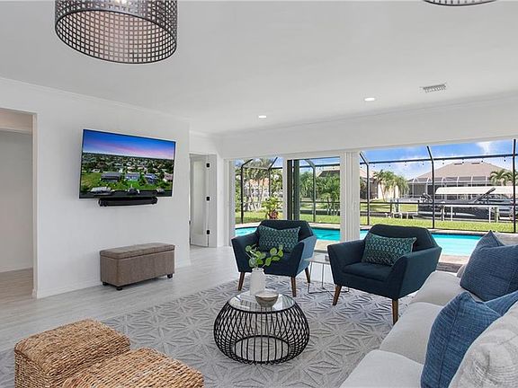 NO FLOOD ZONE- FLOOD INSURANCE NOT REQUIRED! Discover this impressive 3 bedroom, 2 bathroom Gulf access home in Cape Coral, offering a serene waterfront lifestyle! Fully remodeled in 2019, this home includes a bonus space that can be used as a den or sitting area and a caged lanai with a custom heated saltwater pool, perfect for relaxation and entertaining. You will appreciate the stylish touches found throughout, including crown molding, a wet bar outside the master bedroom for making coffee or a quick nightcap, and a modern kitchen with waterfall island and elegant cabinetry, sleek appliances, and custom tile backsplash. Enjoy the expanded pool cage and paver area, along with a new roof, new irrigation system, and fresh exterior paint. Notably, the home experienced no water intrusion from Hurricane Ian. The home also features impact windows and doors for enhanced safety and energy efficiency, and a Google Nest system for modern convenience. The property boasts a private boat dock with a new 8,000 lb boat lift, allowing you to head out on your boat throughout the canals to the waterfront restaurants or out to the Gulf. With a location near all the best amenities that Cape Coral has to offer, this stunning home combines modern updates with waterfront charm, providing a perfect retreat for those ready to live the laidback Florida lifestyle!