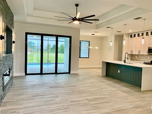 Welcome home to this elegant NEW CONSTRUCTION POOL HOME located in desirable SW Cape Coral neighborhood. Gorgeous split plan 3-bedroom (plus den), 3-bath, 3-car garage home features a cohesive modern design inside and out. This semi-custom home is designed to maximize natural light and create a seamless flow with uninterrupted sight lines throughout the main living areas and screened in paver pool deck & lanai giving way to the sensational finishes. You will enjoy and appreciate all the details of this open floor plan including: impact windows & doors, 9’4” ceilings, 8’ doors, insulated garage doors, white shaker cabinets, quartz counter tops, quartz waterfall edge kitchen island w/breakfast bar, stack stone accent wall in living/great room with linear electric fireplace & TV recess, outdoor kitchen, wood plank porcelain tile floors thru out, mixed metal hardware and fixtures, ceiling fans & inside laundry room. Owner’s suite is a comfortable space with 2 walk-in closets, double sinks, large walk in shower, & linen closet . There are two nicely appointed guest bedrooms & guest baths (pool bath has shower/ tub-shower combo in other. Den has French doors to close off for privacy. Conveniently located, minutes from shopping, restaurants, schools, parks & more. City water & sewer is in. Schedule your showing today!!