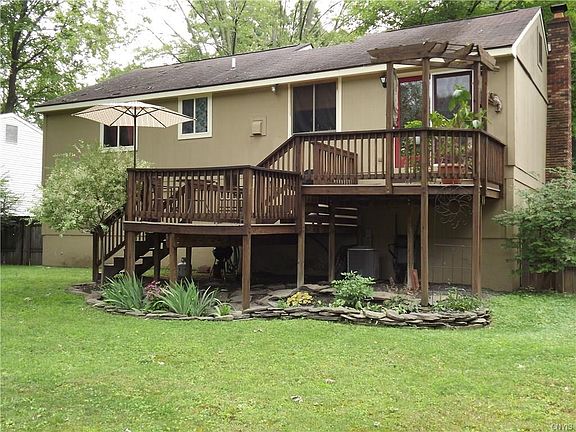 This 3/4 bedroom 3 bath home has been well maintained and is situated on a tree lined street in the village of North Syracuse! Close to everything and the pride of ownership shows through! Updated Kitchen with stainless appliances and new counter tops. Newer carpets & floors. Master bedroom has it's own bath. Lower level has a cozy family room with built ins and a wood burning fireplace. Large additional bedroom with full bath also on the lower level. All appliances stay including the washer and dryer. New hot water tank and central air unit. Overlook the fully fenced park like backyard from your 2 tiered deck. Beautifully landscaped! MUST SEE!!
