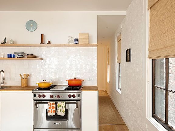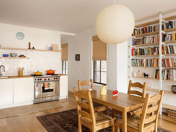 Upon entering the home, you are welcomed into the main living space where an abundance of southern light floods in. The spacious and airy open floor plan makes entertaining in this space extremely enjoyable. The built in Rakks shelving perfectly frames the wood-burning fireplace creating a cozy atmosphere. The renovated Reform kitchen is equipped with state-of-the-art appliances including a Wolf range and oven, Fisher and Paykel French door refrigerator, and Miele dishwasher.