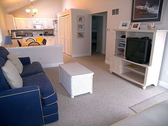 Beautiful and modern 2nd floor condominium with tall cathedral ceilings for an open feel and plenty of natural light. This unit boasts a spacious living room, adjacent dining area and modern kitchen, along with two spacious bedrooms and one full bath. With electric heat and central air, you can use this unit year round and enjoy mornings and evenings on the deck with awning and a peek-a-boo bay view! Parking is included for your convenience and this unit will be conveyed with furniture and appliances, less personals. The condominium fee is paid $500 every 6 months (about $84/mo.) and includes the cost of exterior insurances and for fire and flood, and routine common area maintenance. Owner pays electric, water and sewer, and cable and phone if desired. There is a common storage in the front of the building as well as storage in the back and fully floored attic, so you can store all your belongings and beach items. Area under carport in front can be used for additional outdoor living and entertainment. This is a small 4 unit condo complex by the bay. This larger than average 2 bedroom condominium must be seen to be appreciated. Easy to show on a lockbox, call today 609-729-5108!