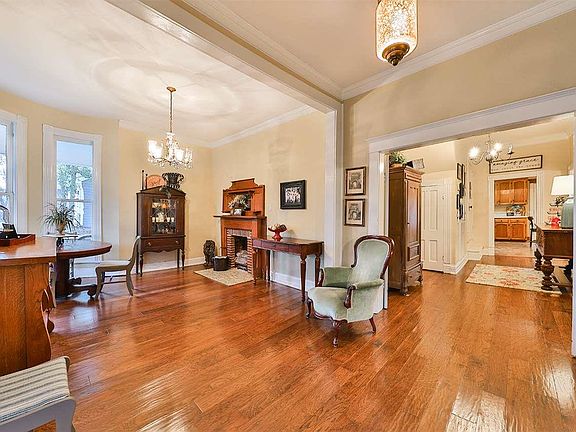 Enjoy Historic Main St. living while swinging on a large wrap around porch featuring an antique curved glass bay window, tapered craftsman style columns with beaded ceiling, as well as a quaint dormer with 3 windows. This charming home has the historic architectural features of original gingerbread trim and gable accents of fish scales and diamonds. Step inside to see the 10ft ceilings that highlight the traditional wide baseboard and crown moldings throughout and so much more! Call today it's a must see.