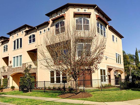 Spacious 3-story Mediteranean style corner townhome with a wrought-iron fenced wrap-around yard (sprinklered!) on a quiet tree-lined street in a very convenient location. Large ground floor suite, perfect for office, bedroom or gameroom. Second floor living area with balcony, dining area, chefs' kitchen and half-bath.Third floor, with 15 foot ceilings, and a separate HVAC zone, has a luxurious master suite with spa like bath and large walk-in closet. Secondary en-suite bedroom, and utility room..Abundant natural light. Hunter Douglas wood blinds throughout. Attached garage. Alarm system. Easy commute to Texas Medical Center, Galleria and Downtown. Convenient to exemplary schools, parks, shopping and restaurants.