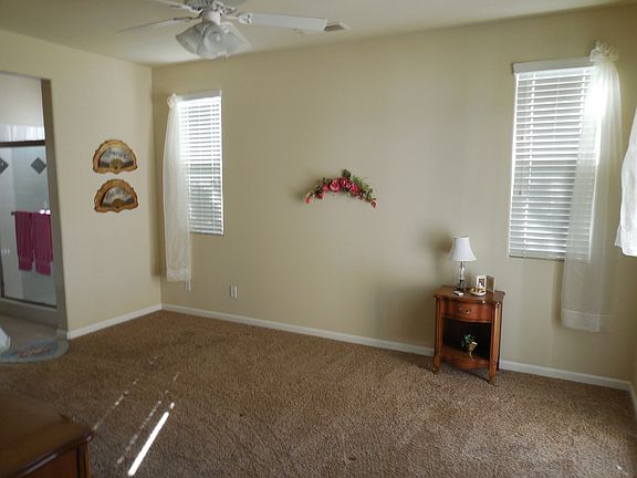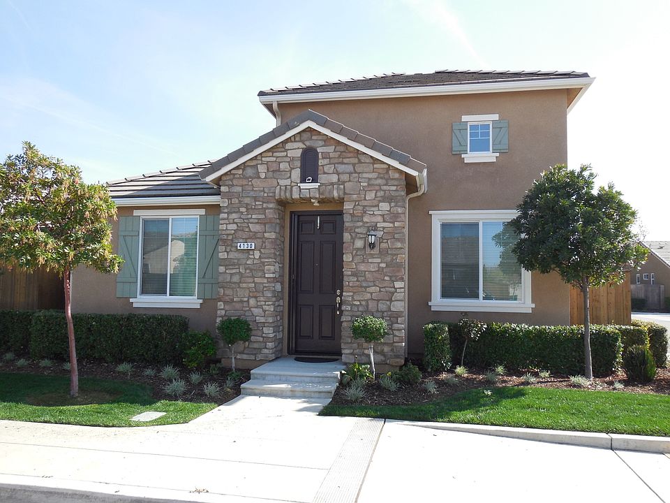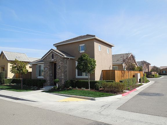 Gorgeous Leo Wilson 2 Bedroom plus den/office and 2 full bath located in the Harlan Ranch Community. Wonderfully kept by the original owner and ready for immediate move in. This home is situated on a corner lot near a cul de sac. Tall cathedral ceilings in the open floor plan. Kitchen with stainless steel appliances, dark cabinets, granite counters with abundant counter space including a breakfast bar. 2" blinds throughout as well as a retractable awning on the patio area. The master features room for a king bed, dual sinks, large walk in closet and slider to the patio. The community features Olympic size pool, BBQ area, parks, trails and club house.
