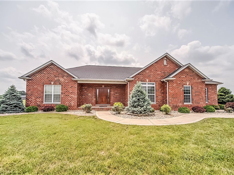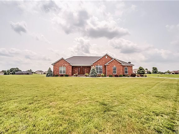 This one-owner, custom 4 bedroom, 3 bath ranch sits on a full acre with extensive landscaping and is move-in ready with new carpet and fresh paint! Featuring a split floor plan with 9’ ceilings on main level and basement, this home offers many amenities. Enter through a beautiful custom wood door into the foyer with ¾” hardwood flooring, also in hallways and powder room. The 19'x22' great room with lighted tray ceiling and stone (gas) fireplace offers plenty of room for entertaining. The spacious eat-in kitchen includes stainless appliances, Cambria quartz countertops and breakfast bar, and ceramic tile. The kitchen opens through sliding glass doors to a covered patio with ceiling fan. New refrigerator, range, and microwave in 2017. The roomy master suite features an en-suite bath with double vanity, storage cabinet, soaking tub, a 5' separate shower, and ceramic tile flooring, as well as a huge walk-in closet. There are three other spacious bedrooms, one of which has a French door and was recently used as an office. Many numerous closets throughout the home. The full unfinished basement includes built-in shelving, egress window for additional bedroom if needed, and rough-in for another bath. The tub/shower is already there and it's actually partially framed out. The 3 car oversized garage has shelving and the concrete driveway adds room for additional parking. The acre lot has plenty of room for a pool and pool house. This quiet country setting on the edge of town provides the best of both worlds.