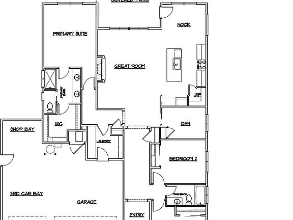 - Built-in Features, Ceiling Fan(s), Double Vanity, Enclosed Toilet(s), Kitchen Island, Linen Closet, Open Floorplan, Pantry, Primary Downstairs, Shower/Tub Combo, Smart Thermostat, Solid Surface Counters, Tile Shower, Vaulted Ceiling(s), Walk-In Closet(s)