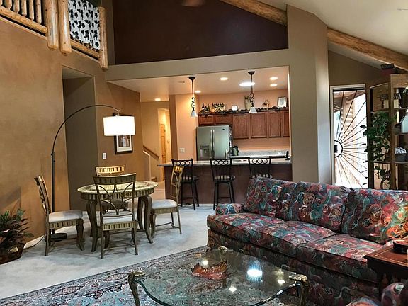 Backing the NATIONAL FOREST is only one of the great features of this exceptional property. Very high vaulted ceiling with exposed beams and beautiful rock fireplace in living room. The kitchen and 2 downstairs bathrooms have been upgraded with granite counter tops. Huge loft area has inviting bedroom and sitting area with bathroom and closet. Skylights in living room and on back deck for lots of natural light. Relax on the back covered deck and enjoy incredible views across the national forest. Home has alarm and 2-car garage, plus, the golf course is just STEPS away. Most furnishings available and negotiable.