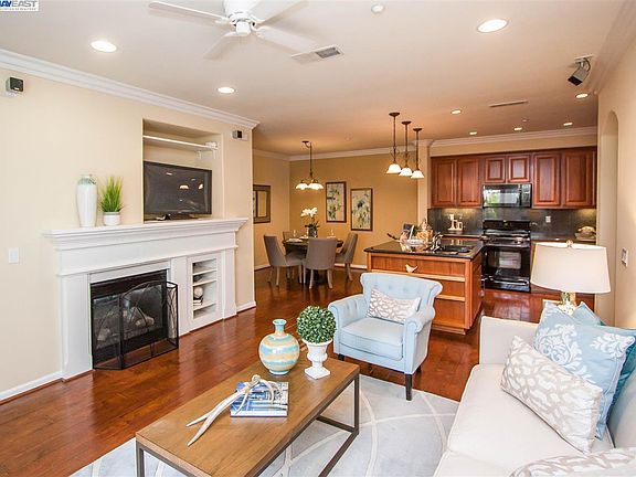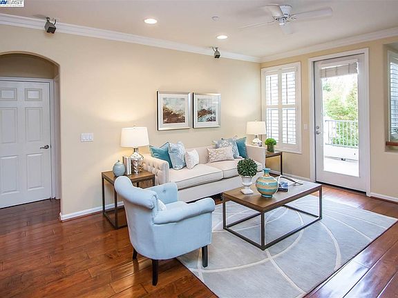 The Villas at Dublin Ranch! Single level, East facing luxury Toll Brothers condo! Features include hardwood in living room, dining room & kitchen, living room w/ crown molding, ceiling fan, recessed lighting, surround sound speakers, gas burning fireplace, media cabinet, & French door to the large balcony. Dining area w/ buffet niche & crown molding. Gourmet kitchen w/ upgraded cabinetry, slab granite counters w/ full backsplash, GE gas burning stove, microwave, & large island w/ pendant lighting. Spacious master suite offers plantation shutters, sliding glass door to balcony, crown molding, bath w/ upgraded tile flooring, large Jacuzzi soaking tub, walk-in shower, dual sink vanity, & large walk-in closet. Secondary bedroom is complete w/ large walk-in closet, additional closet, & sliding glass doors to private balcony w/ wrought iron railing. The adjacent bath has tile flooring & bathtub w/ tile surrounds. Indoor laundry, 2 car garage w/ built-in cabinetry, community pool & gym! (furniture is for illustration only and it is not included in the rent) owner pays HOA, tenant pays all utitlies