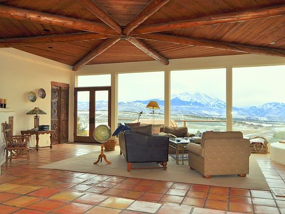 This is the real thing! Spectactular Santa Fe style adobe home situated on just over ten-acres bordering BLM lands with commanding views of the entire Elk Range, Aspen ski areas and Mt. Sopris. Renovated in 2004, the home includes marble, granite, flagstone, slate and hardwood finishes and a wonderful kitchen with stainless appliances. Rambling along the upper portion of the property, the home has five to six bedrooms, six baths, six woodburning fireplaces and plenty of outdoor living areas including patios, decks, courtyards and even a swimming pool. Ideal location for horses with fenced pastures, corral and sheds.