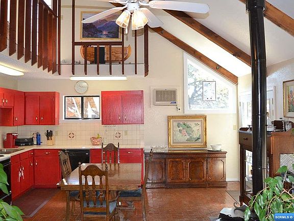 - LIVING ROOM: Wood Stove, Cathedral/Vaulted Ceiling, Blinds, Ceiling Fans, Beamed Ceiling