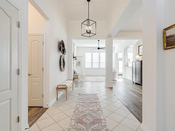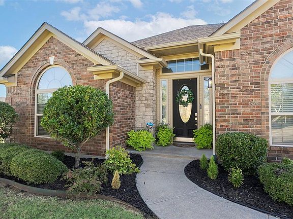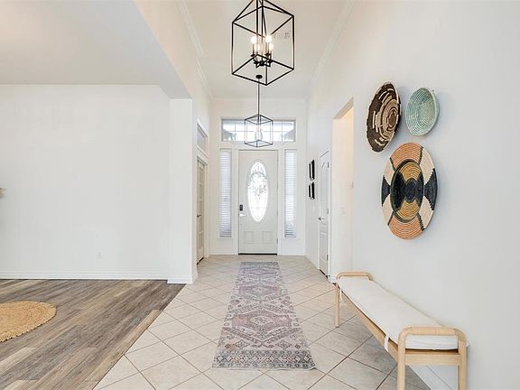 Beautifully updated Carrington home offers split bedroom floor plan with 3 bedrooms plus a large office, flex formal dining and 3 car tandem garage. Open concept, soaring ceilings and extensive windows let in an abundance of natural light, making a bright and cheery gathering place. Updates in 22/23 include paint throughout, all countertops, sinks and faucets, backsplash, hardware and light fixtures, all new stainless steel appliances, including freestanding gas stove/oven, and garbage disposal, as well as epoxy coat garage floors, storm doors and electrical updates. Home features wood look floors and tile, no carpet. Corner lot with a double gate and steel fenceposts enclose the spacious backyard with raised beds and extended patio. Eye-catching rock fireplace with gas logs. Utility room is a really nice size with plenty of counterspace, hanging rack, and a sink. Oversized primary bedroom with a corner wrapped in windows for a perfect reading nook, work space, or workout equipment. The suite is completed with a separate shower and whirlpool tub, double vanities, built-in medicine cabinet, and big walk-in closet with seasonal storage. Other amenities include a storm shelter in the garage, underground sprinklers, security system, and a class 4 shingle roof in 2021 for that lower insurance rate. Welcome Home!
