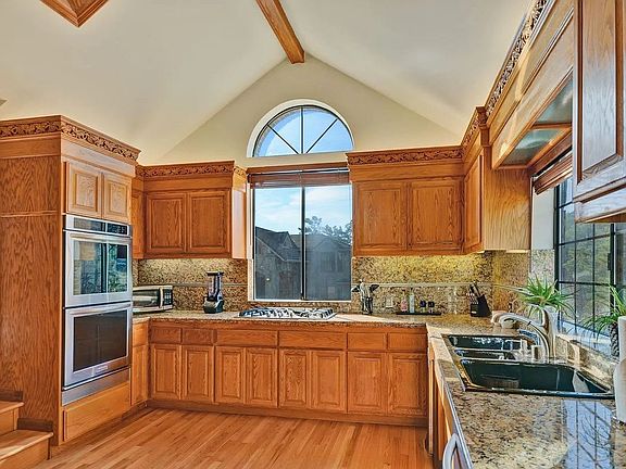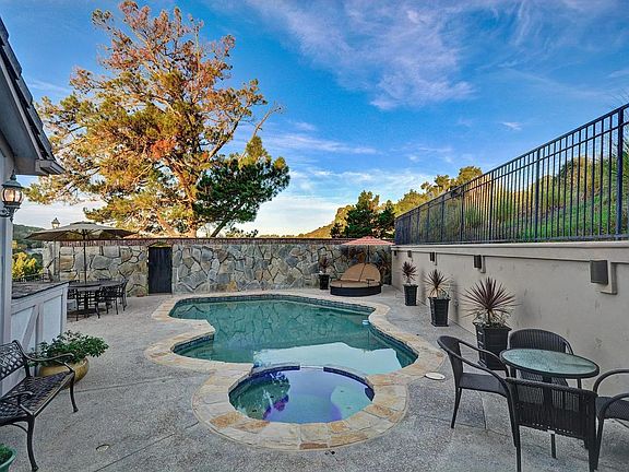This fully furnished beauty is a must see! The large home features 5 bedrooms and 5 1/2 bathrooms. It's roomy interior totaling 4721 square feet is loaded with luxurious finishes and features. As you walk in the door your eyes are immediately drawn to the craftmanship and details the interior offers. Extra-large dining room for entertaining which connects to a meticulous family room/great room with spectacular full bar. The kitchen is equipped with all stainless-steel appliances including refrigerator with water and ice maker, double oven, gas stovetop, microwave, dishwasher, loads of countertop space and storage. There is a kitchen nook that overlooks the backyard pool and spa. The sunken living room is immaculate and features a gorgeous fireplace and beamed ceilings that draw your eyes up. There is a door out to the patio with seating and table. Also, out that door is a Bocce ball court for your entertainment. Steps up from the living room is an executive office that oozes elegance. The home has a sauna for your enjoyment. There is a dedicated laundry room. Hardwood floors in most of the downstairs, carpeted stairs and upstairs to keep the bedrooms cozy. Walk up the gorgeous, curved staircase where you will find large bedrooms complete with bathrooms. The primary is huge and has amazing views and an abundance of light. The primary bath is incredible with extra-long vanity with tons of counter space. Walk up a couple steps to a fantastic tub for relaxing. The gated home sits on a large lot and is shared with another home on adjoining lot. It has a 3-car garage with plenty of guest parking. The home is equipped with alarm system. You have to see this impressive home to understand the radiance it offers. Don't miss out!