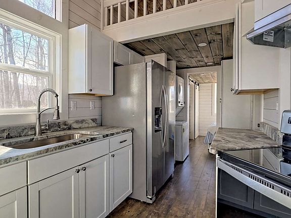 PRICE REDUCTION! Become part of the TINY HOUSE movement. This super cute, super trendy tiny home offers 1.175 acres on an unrestricted lot, featuring a Seasonal Mountain View! This tiny home was built locally and completed in 2023 with a metal roof and a covered porch with composite deck boards. Enjoy all the luxury updates like granite countertops, stainless steel appliances, LVP flooring and neutral shiplap walls throughout. The loft area is perfect for storage or a king size bed. Enjoy a stack washer and dryer, stylish tiled shower, and extra cabinet space in the kitchen. You will find this home has wooded privacy, and mountain views, yet easy access to Hiawassee and Blairsville. All brand new furnishings included. This is a must see to appreciate the tiny home lifestyle. Motivated seller bring all offers!