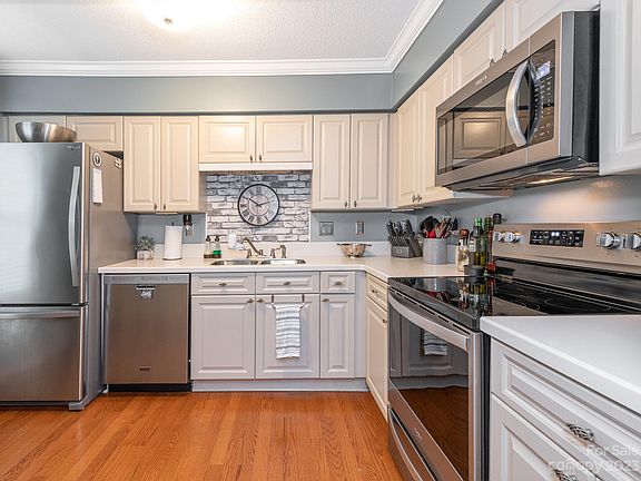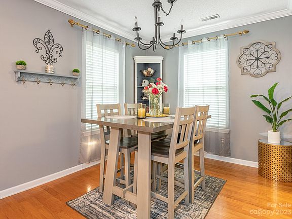 Beautifully updated end unit townhome in highly desired Melrose Townhomes - a well-maintained community with tons of amenities located just minutes from downtown Matthews! This unit is located on the end giving it the largest yard space, perfect for entertaining! Welcome in to open living and dining space with wood flooring throughout. Accent wall and tasteful interior paint gives home the perfect custom touch. Spacious kitchen with bright white cabinets & counters plus new SS appliances. Primary bedroom is on main level perfect for privacy. Attached bath and HUGE walk-in closet! Upstairs find 2 guest bedrooms and full hall bath. Plenty of options for a home office space or bonus room. Side patio is an absolute dream! Extended size allows for grilling space and dining table for entertaining plus privacy as the end unit overlooking new landscaping! Community updated the pool/gym area close to the unit. UPDATES: 2019 roofing & HVAC system, downstairs flooring, and a patio extension.