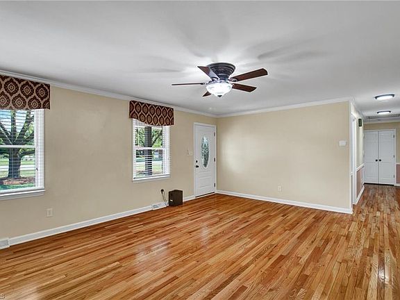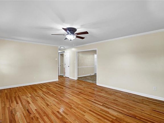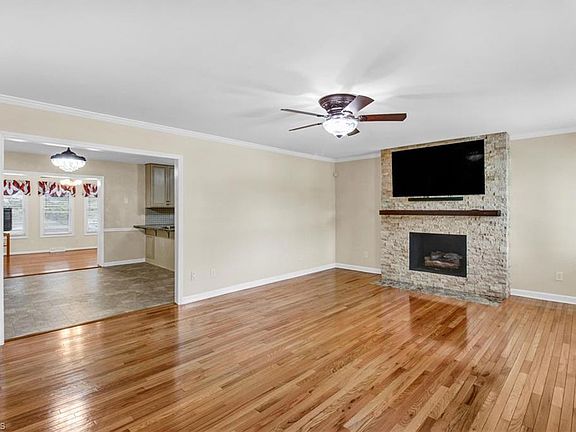 Renovated white brick ranch with wood accents, columns, and a charming farmhouse front porch! This move-in ready home features gorgeous hardwood floors throughout, a cozy living room with fireplace, and an open updated kitchen with custom cabinets, pull-outs, lighting, and granite countertops. A sunroom opens to a large deck—perfect for entertaining. Includes 3 spacious bedrooms with ample closet space. The primary suite boasts a private bath with a walk-in zero-entry shower. Full unfinished basement offers tons of storage, a small kitchen, full bath, and an extra 1-car garage for yard equipment. Paved driveway leads to a 2-car garage plus RV hookup. Enjoy mature trees, a second patio, and plenty of outdoor space. and dual access with this great corner lot! This home truly has it all—ready for its new owner! Seller is a NC Broker.
