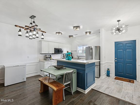 Fresh paint in the hallway, kitchen, dining, and living rooms gives the space a bright, refreshed feel. Newly installed wainscoting in the foyer, kitchen, living room, and hallway adds coastal charm throughout. Updates include new lighting fixtures, ceiling fans in both bedrooms, and a dual ceiling fan in the living room. Major upgrades such as a new HVAC system, new siding and flashing, and a 50+ gallon water heater with booster enhance comfort and efficiency. A rare oversized 1-car garage with electricity is conveniently located nearby. As an added bonus, all furnishings are negotiable.