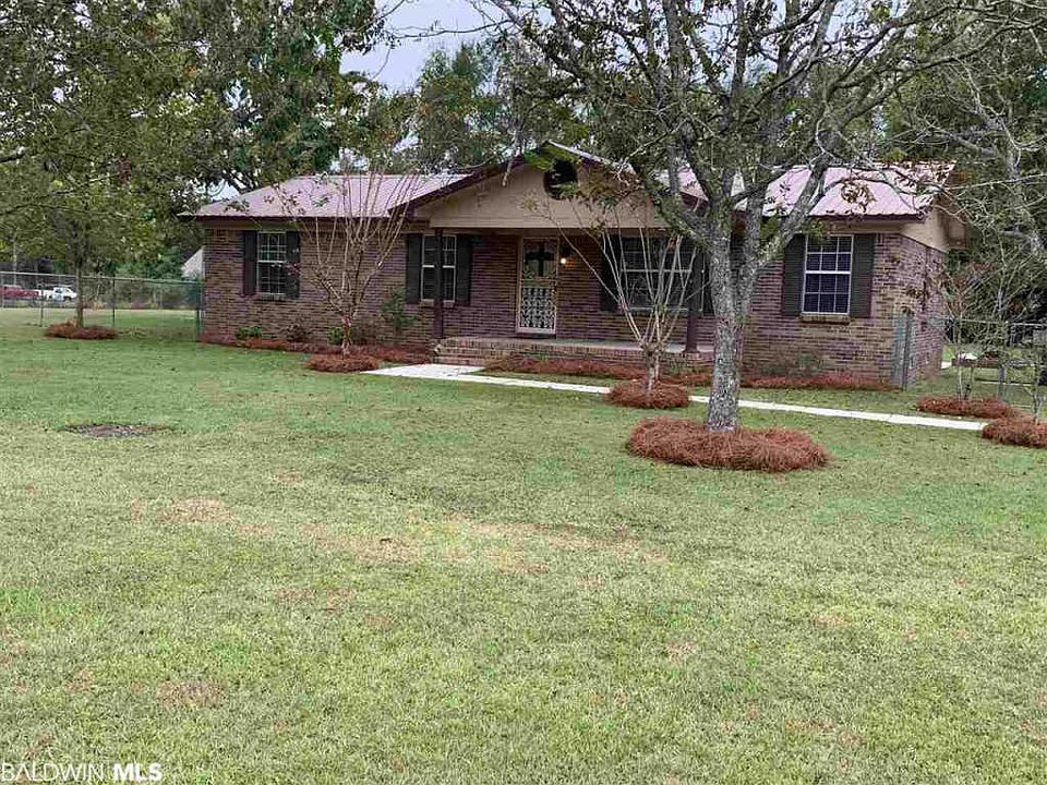 PRICE IMPROVEMENT - motivated seller!! Well maintained 3 bed/2bath four-sided brick home on one acre, fully fenced with two double gates and one walk-thru gate. Beautifully landscaped with fruit trees, crepe myrtles and a royal empress tree. Large back patio with built-in fire pit overlooking peaceful backyard with no neighbors directly behind you. All stainless appliances convey. Home has laminate and tile flooring with carpet in bedrooms. Kitchen has large breakfast bar with separate eat-in dining area. Master bedroom has an attached bath with tub surround. At back of property is a lean-to which is great for storage or lawn equipment. Just 5 minutes from Bay Minette and only minutes to the elementary school. Perfect for young families, first time buyers or retirees or anyone wanting to invest in an awesome rental property. All dimensions are considered approximate and should be verified by buyer and/or buyer agent.