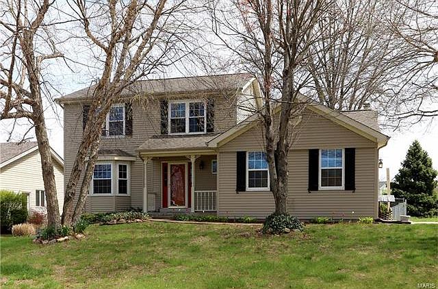 Lovely two story home located in a top school district in St. Charles county. Home is located in a lovely cul de sac neighborhood and sits on a landscaped corner lot with oversized two car side entry garage. Home is relatively maintenance free with enclosed soffits and steel siding with a custom covered patio perfect for relaxing after a long day. When entering you will appreciate the lovely living room and dining room, with crown molding and unique pocket doors which could allow for privacy if a dedicated office space is your need. Solid six panel doors and the updated kitchen with 42â cabinets, soft close drawers and granite countertops. Upstairs boasts new carpet and a lovely master bedroom suite with large walk-in closet, with some built ins and a beautiful masterbath with marble walk in shower and double sinks. Home has been well maintained and has newer furnace, water heater and recently serviced air conditioner. All appliances including washer and dryer stay