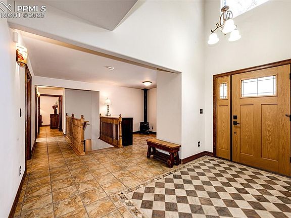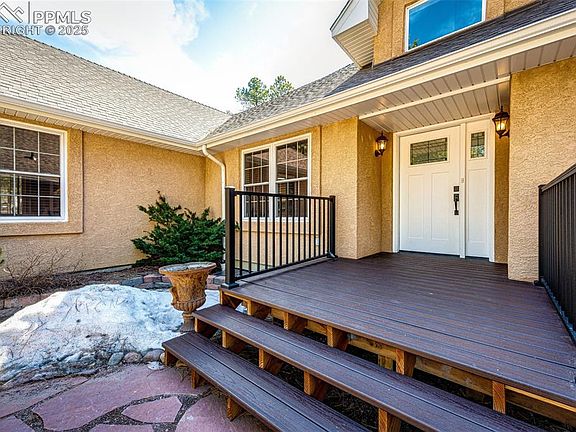 New street name, same great location & privacy on a 5-acre fenced lot, with 2 gates, mitigated Ponderosa Pine trees, park-like backyard, natural rock outcroppings, and views of Pikes Peak. Easy commute to Colorado Springs, Monument or Denver. This home has some fantastic updates including a new air conditioning system with 6 separate remotes, new asphalt driveway with gravel turn around on both sides and easy access to 20'x10' (2023) shed, newer roof and gutters (2022), newer boiler and gas water heater (2021), new walkway, new front door and new Trex front porch certainly add both practicality and beauty but also enhances the aesthetic appeal of the home. This unique steel-framed home has 3 bedrooms, all new stained solid wood doors & trim, 3 renovated bathrooms with porcelain tile, natural gas (NO propane), with easy to clean, non-allergenic main level tile. The kitchen boasts a Bosch dishwasher, double ovens and 8 windows providing plenty of sunlight. Kitchen upgrades (2021) also include granite counters with matching windowsills, gas Bosch 5-burner cooktop, new stainless sink and an articulating faucet. Main level windows have new screens. The expansive windows throughout the home and skylights allow for natural lighting and beautiful views. With the benefits of (energy saving, increased energy efficiency, non-allergenic to name a few) radiant floor heating on the main level and extends to the basement and oversized 3-car attached garage with workshop area. The unfinished insulated basement can be accessed from the garage or main level and is ready to design to fit your needs with a bathroom rough-in, egress windows, and new wood shelving for easy storage. The landscape, beautifully adorned along with nature's own design, provides a harmonious blend of tranquility and natural beauty. All this and NO HOA!!
