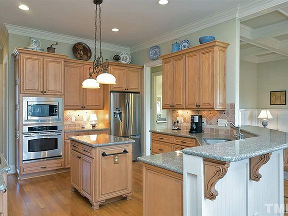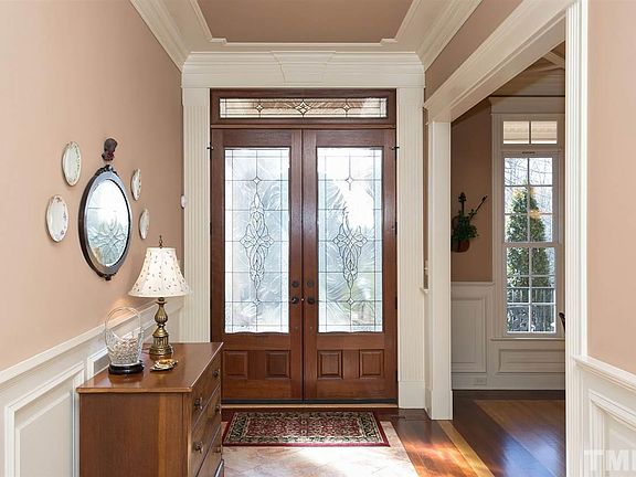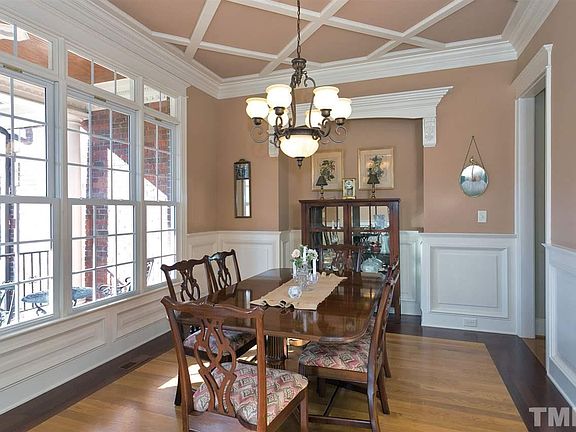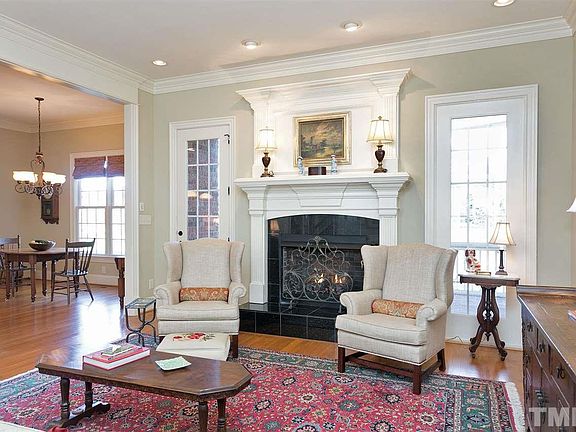 VERY CONVENIENT LOCATION to downtown Raleigh, 540 Southern route, I40, Wake Tech. This all brick custom built home in Banks Pointe has it all: 1st floor master, morning room off kitchen w/fireplace plus fireplace in great room, extensive custom moldings throughout, 8' doors, custom hardwoods w/inlays, screen porch, 2 laundry rooms, bonus w/wet bar, upstairs hall has built in desks and cabinetry, continuous hot water system, sealed crawl space, irrigation system, screen porch/patio, termite warranty.