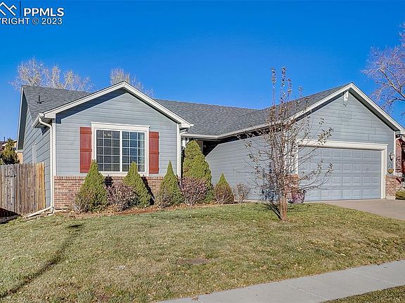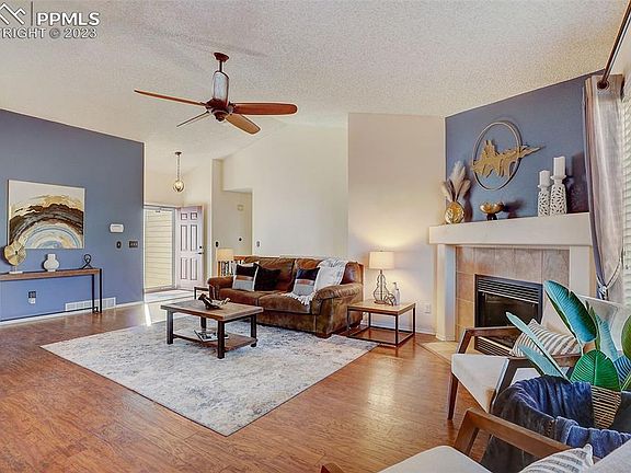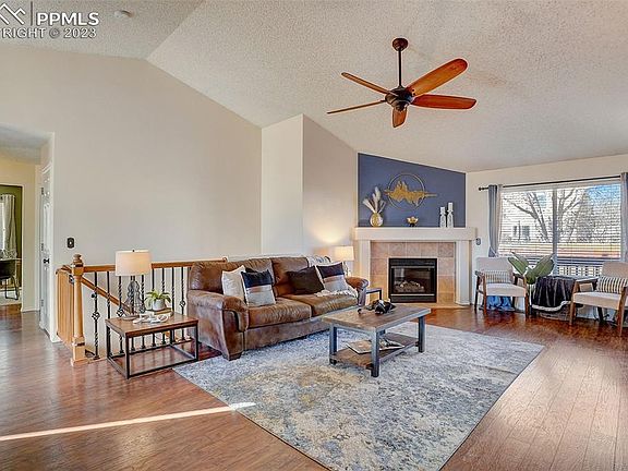 Main Level Living with sophistication! This gorgeous ranch style home features a coveted floor plan with three bedrooms plus an office/flex space, and three bathrooms, tastefully updated. Be welcomed by hummingbirds in the morning! The backyard is a private haven with awe-inspiring Pikes Peak views and a special touch – a dog run affectionately named "Poo Platz." As you step into this enchanting home, the open living room extends a warm welcome with gleaming wood floors that gracefully traverse the main level. The updated kitchen features granite counters, stainless steel appliances including a double convection oven, a capacious pantry, and an abundance of cabinet and counter space. Connecting seamlessly to the walk-out dining area, it sets the stage for delightful gatherings, truly. The primary suite is a sanctuary, featuring an elegantly updated ensuite bathroom with custom tile flooring, new fixtures, a double vanity, and a jetted tub and walk-in closet. The main level hosts two bedrooms, a convenient office, and not to be overlooked, one of the most beautiful guest baths. Venture downstairs to discover a private guest bedroom, an entertainment room complete with pool table for a fun night in (can be modified into a 4th bedroom). Recently stained and spacious wood deck with a beautiful water fountain/bird bath and storage shed. Enjoy roses in late summer. This home offers easy access to shopping, entertainment, and restaurants, while being just minutes away from Fort Carson, Schriever, and Peterson AFB. Make this move-in ready home yours.