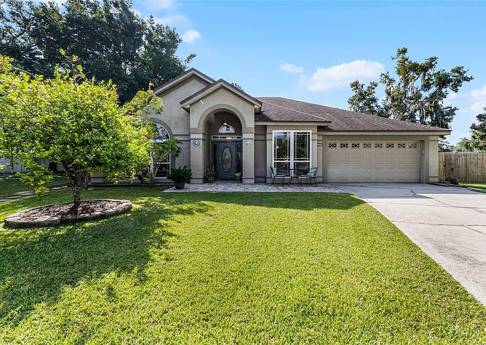 One or more photo(s) has been virtually staged. Nestled in a tranquil cul-de-sac, this charming, well-cared-for 4-bedroom, 3-bathroom home sits on a spacious quarter-acre lot, offering both privacy and ample room to enjoy. A brick-paved walkway guides you to the welcoming front entrance, where you’ll step into an open-concept living space flooded with natural light and high ceilings. To the left, the formal living room is perfect for relaxation, while the formal dining room on the right sets the tone for elegant gatherings. The first bedroom, currently used as a home office, features its own private bathroom, providing both versatility and convenience. The primary suite offers a serene escape, complete with a spacious bathroom featuring a tiled transitionless shower entry, corner vanity, floor warmer, towel warmer, and a walk-in closet. On the opposite side of the home, two additional bedrooms share a second bathroom, ensuring comfort and privacy for all. The heart of this home is the inviting family room, perfect for entertaining or relaxing. Overlooking the family room is the well-appointed kitchen, which keeps you connected with family and friends as you cook. Enjoy casual meals in the kitchen’s built-in storage banquette, or take your morning coffee outside to the patio, where a screen-enclosed pool and spa await. The impressive, fully fenced backyard—where “large” is an understatement—is ideal for weekend barbecues, and the soothing sounds of rustling clumping bamboo add to the peaceful ambiance. Gather around the fire pit under the pergola for cozy evenings. Located in the highly sought-after Chickasaw Trails neighborhood, this home is surrounded by mature landscaping and provides convenient access to all your essentials. Schedule your showing today!