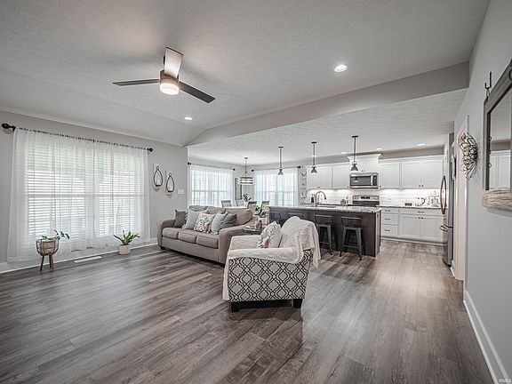 This amazing 3 bedroom, 2 full bath home in the sought-after Creekside Meadows subdivision on Evansville's North Side is practically brand new and definitely move-in ready! Inside, you'll find luxury vinyl plank flooring throughout the open floor plan design. The kitchen boasts granite countertops, castled cabinetry, and a large island - perfect for all your cooking and entertaining needs. The spacious living room is flooded with lovely natural light, making it the ideal spot for hosting gatherings. And just down the hall is the large owner's suite, complete with an en suite bathroom and a generous walk-in closet. The other two bedrooms also offer nice-sized closets for ample storage. Outside, there's a gazebo where you can enjoy the upcoming fall evenings - a perfect spot to unwind and relax after a long day. Don't miss this great home!