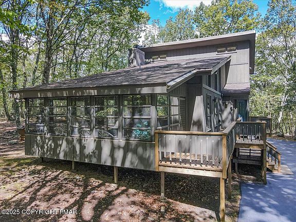 Highest and Best Offers due Wednesday, 9/10 at 5:00 PM. If you are looking for a retreat to call home, then you've found it. This property is kept in immaculate condition and brings the essence of a mountain home to life. Located at the end of a cul-de-sac and surrounded by trees, this is a nature lovers paradise. When you reach this home you'll immediately notice the expansive front deck that introduces you to a wall of windows. Walking in through the front door, you are welcomed by a natural light-filled great room with eighteen-foot ceilings at their highest point; hardwood floors; large wood cased windows; a brick fireplace, and tongue and groove walls. This property has an open floor plan with an easy flow, which is ideal for the upcoming holidays. In total, you'll find four bedrooms and two full bathrooms. The primary bedroom on the first floor has sliding doors to the back deck and also provides access to a large bathroom, which contains a Jacuzzi tub, separate shower, and a built-in makeup vanity. The additional bedroom on the first floor and the two on the upper level offer their own appeal. There is a four-season sunroom complete with heat for the winter and air conditioning for the summer. This room is undergoing a refresh with new carpeting. The 48' X 18' back deck is an entertainer's dream and you can imagine all the summer celebrations you will be hosting with family and friends. Whether it's the built in seating adjacent to the decorative flower pots or the wood table and seating created specifically for the middle of the deck, the welcoming atmosphere cannot be passed up. This home has so much to offer.