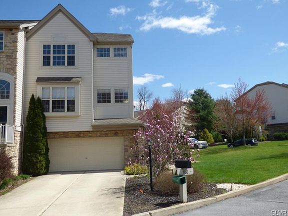 Spacious end unit townhome located in exclusive Waterford Court, Southern Lehigh School District. Main level features hardwood floors and a spacious layout with plenty of light. Holiday entertaining in the living and dining room will be warm and inviting with the gas fireplace and the easy flow of an open concept floor design. Updated kitchen features granite counters, sunny breakfast nook and stainless steel appliances. Freshly painted. Large master bedroom with jacuzzi tub in master bath and walk-in closet. The lower level features a finished family room with sliding glass doors leading to a custom patio and fenced in yard. Large two car garage. You will love the colors and spacious design of this large home!