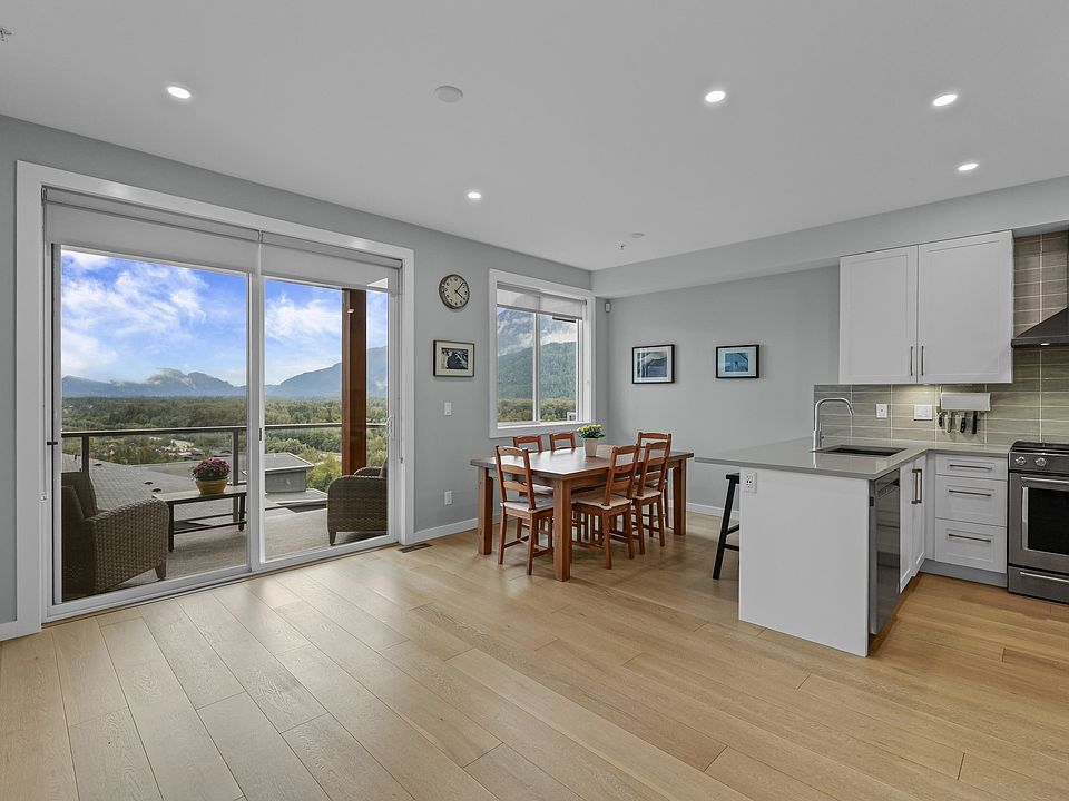 Spectacular panoramic mountain & valley views! A gorgeous West Coast modern design, south-facing, 3 bedroom Skyridge townhome with private views. Energy efficient and loaded with upgrades: hot water on demand, gas furnace, gas fireplace, soundproofed interior walls, wide plank hardwood flooring, wool carpets, & gourmet kitchen w/ 5-burner gas convection oven. Open floor plan with a balcony off the living room & the lower recreation room opens to a backyard patio with more views. Plenty of storage with a garage and a flex room. A stunning home in a friendly community located beside the park, and steps to the bike & forest trails! You'll love living the Squamish lifestyle from this stunning home.