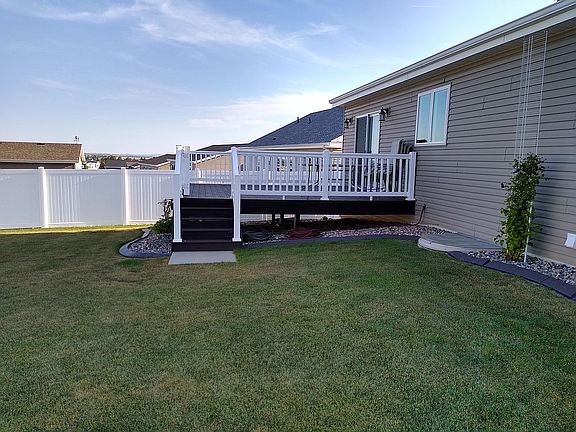 Wonderful home that is well-maintained and it shows! Ideal location, 2 blocks from Sunrise Elementary School in NE Bismarck. No maintenance fencing, decks and railings. Relax on the large 16 X 16 rear deck. Many upgrades, new countertop, 2 year old appliances, furnace humidifier, water softner, underground sprinklers, central air and a quality 12 X 16 yard garage. Easy access off 43rd Ave NE gets you anywhere you want to go. The open concept living, dining and kitchen area makes family gatherings comfortable. The welcoming covered front porch provides nice shelter and is a great place to just relax! The kitchen offers a large center island, electric stove, refrigerator, dishwasher, microwave, garbage disposal, upgraded light fixtures, and rich laminate flooring. Two bedrooms on the main level including the master bedroom suite with dual closets, full tub and linen closet. A second full bathroom is also located on the main floor. The lower level is finished offering 2 additional bedrooms, generous family room and game area, storage, full bathroom and laundry with utility sink. The triple garage is heated, fully finished with a large work bench, utility sink, and floor drain. No direct backyard neighbors. Check out that sunrise from the back deck! Call for an appointment to see this quality home.