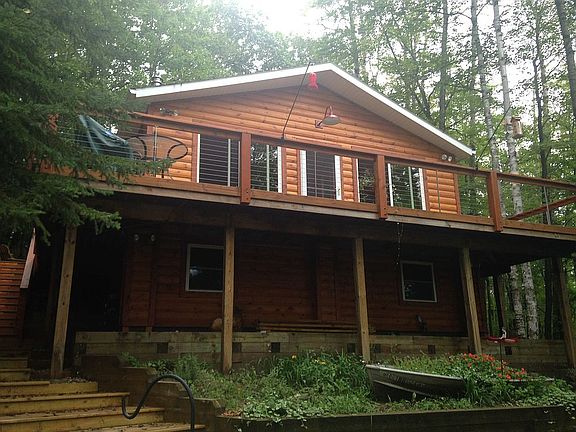 Main house- beautiful log sided home in the woods with a 900 sq ft wrap around deck facing west over looking quiet Sherry Lake. Inside the house has pine car siding throughout on walls and ceiling. Kitchen has wood floors and Colorado pine thick live edge counters, copper sink and top of the line stove. Open concept to carpeted living room with large windows that gives you a feeling of being in a tree house and it has a jotul wood burning stove. Bedrooms are carpeted. Bathroom has deep soaker tub. Roof is 2 years old. Under house has an enclosed storage area, mechanics room and laundry room. On the lake side of the house there is a fenced in garden area for growing veggies and flowers. There is about 1000 ft of lake front on a very quiet lake with plenty of fish for catching (perch, bass, crappie, bull nose catfish). Property includes 25 acre as so no one can build next to the house or across the lake. Guest house- a second beautiful building built in 2017/2018 as a guest house and work from home office. It has a full bathroom, large walk in closet for storage and a loft for sleeping. It has an attached heated two car garage with built in work bench and a porch over looking the woods and wetlands. Large windows allow for light and a great view of wildlife. The main room has tall vaulted ceilings and carpeting. There is a gas stove which heats the house easily in the winter and a split unit for cooling or extra heat if desired. The space also has a kitchenette with small frog and sink. Pole barn- 900 sq ft metal pole barn with cement floors. Includes a storage room with heavy duty built in shelves, work bench and cabinets for even more storage. There are even two sites to put up a tent if you want to camp on the property. This property sits back about 1/4 mile from the road.