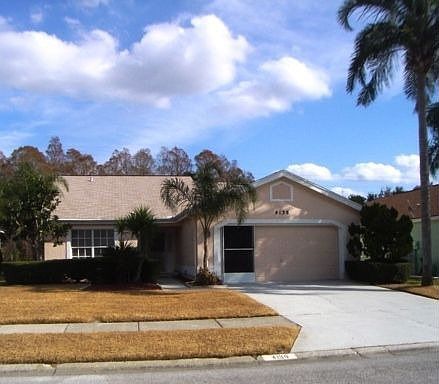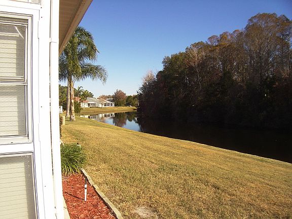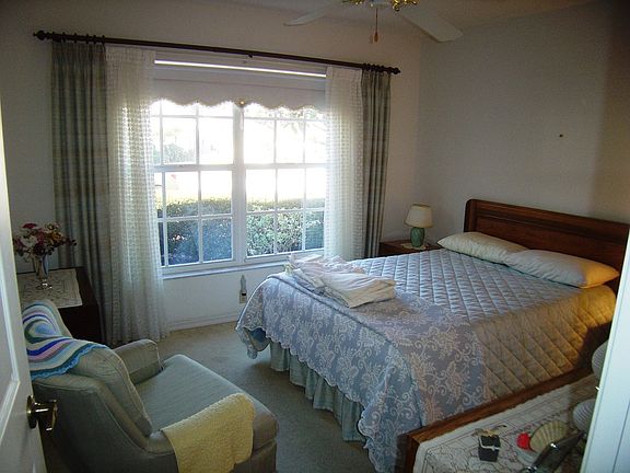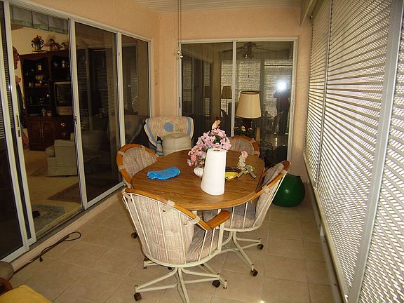 Enjoy the waterfront view from the enclosed porch of this well maintained 2 bedroom, 2 bath home. Large den with built in bookcases could be 3rd bedroom. Split bedroom plan with master suite off separate hallway with its own entry to enclosed back porch. Hurricane shutters on back enclosed porch, safety and security film on all other windows with Warranty transferable to new owner. Water softener included. New A/C compressor May 2010. Built in speakers provide surround sound throughout the home with radio unit in eat in kitchen. 2 community heated pools for your enjoyment.