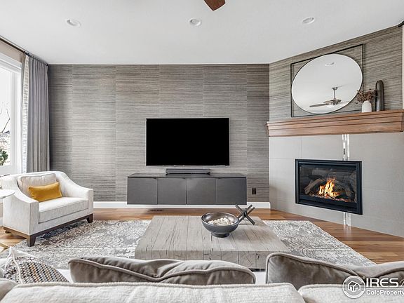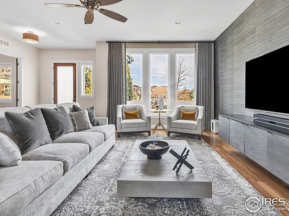 Steeped in contemporary allure, this Northfield Village home offers a high-end escape within a coveted Boulder locale. A covered front porch invites residents into an open main level flowing with 10-foot ceilings and Tigerwood flooring. A modern fireplace glows with warmth in the living room as glass French doors open to a bright and airy flex space, currently used as a convenient home office. Sophistication and elegance shine in a gourmet kitchen equipped with high-end appliances, knotty walnut cabinetry, a walk-in pantry and a butler's pantry. This home offers an entertainer's dream living area with outdoor connectivity through a NanaWall to a private, covered patio and thoughtfully manicured yard. Retreat upstairs to a spacious primary suite boasting soaring ceilings, a peaceful sitting area and a spa-like bath. Guests are treated to two additional bedrooms, one with an en suite bathroom and lovely views. A third-floor sky loft with a wet bar and refrigerator opens to a rooftop deck flaunting expansive Flatiron views and beautiful ipe wood. Downstairs, a spacious recreation room and 4th bedroom feature large windows and finishes consistent with the upper level luxury. Enjoy the comfort of mini-split climate control in an oversized 2-car garage with a high clearance garage door and built-in cabinets/workbench. Residents will appreciate spacious closets and storage areas throughout the home. Upgrades to this Energy Star certified home include owned solar panels, dual-zone heating and A/C systems and Hunter Douglas Silhouette automated blinds.