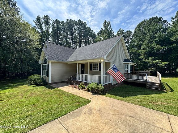 This charming 3-bedroom, 2-bath ranch has all the space and comfort you've been searching for. Inside, an open kitchen flows seamlessly into the dining room — perfect for entertaining. The nearly 1-acre private corner lot is surrounded by beautiful landscaping and privacy trees. Enjoy peaceful mornings on the quaint covered front porch, or relax on the large covered back deck that wraps around the side of the home. Washer and dryer convey, plus a newer roof and recently pumped septic offer peace of mind. Located just 20 minutes from Wake Forest, you'll love the quiet setting outside city limits — and with no HOA, you can truly make this place your own.