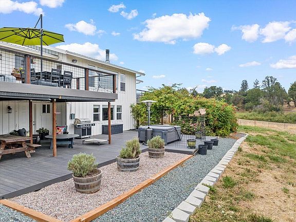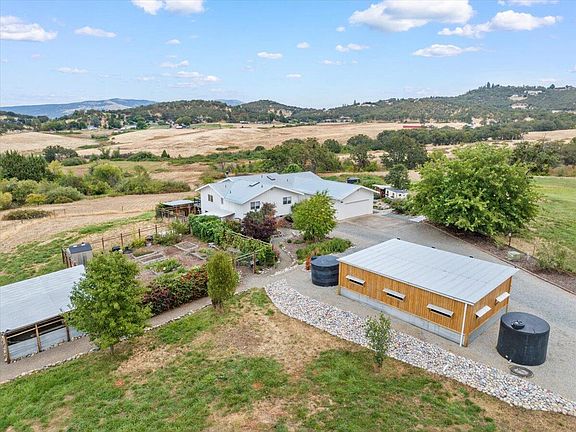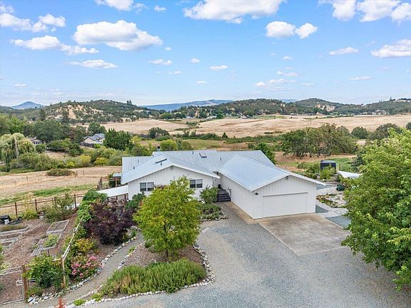 Minutes from Jacksonville and Medford you'll find this well maintained country home with a modern twist. Panoramic views from the nearly 3000 sqft home that features a remodeled kitchen, large great room with vaulted ceilings, river rock fireplace, huge picture windows and 4 bedrooms and 3.5 bathrooms. Downstairs you'll find bonus rooms suitable for extra bedrooms or office space with plenty of storage. Enjoy the newly installed synthetic wrap around decking as you overlook 5.54 acres, 2.5 of which is crossed fenced. Property has MID irrigation and 3- 2500 gallon storage tanks. A large fully fenced garden with raised beds awaits your green thumb along with dog kennels, new three stall carport, and an electric security gate at the entrance to the property. Updated siding, new energy efficient electric HVAC, freshly laid gravel & ornamental landscaping around home makes for the perfect setting to relax in the new, included hot tub. Seller to offer flooring credit with acceptable offer.