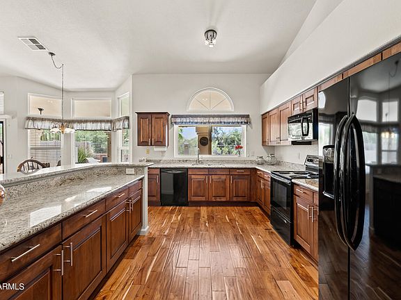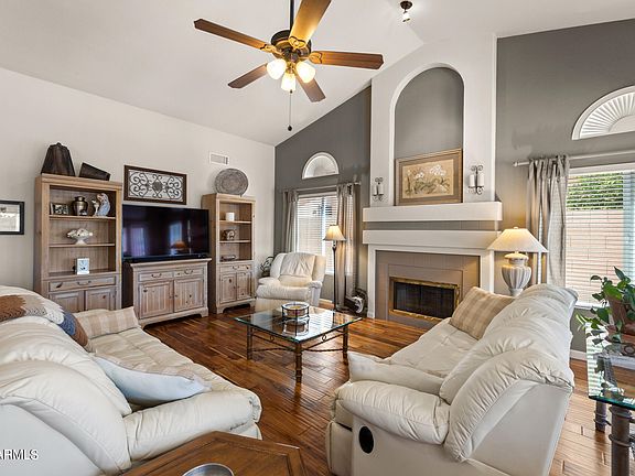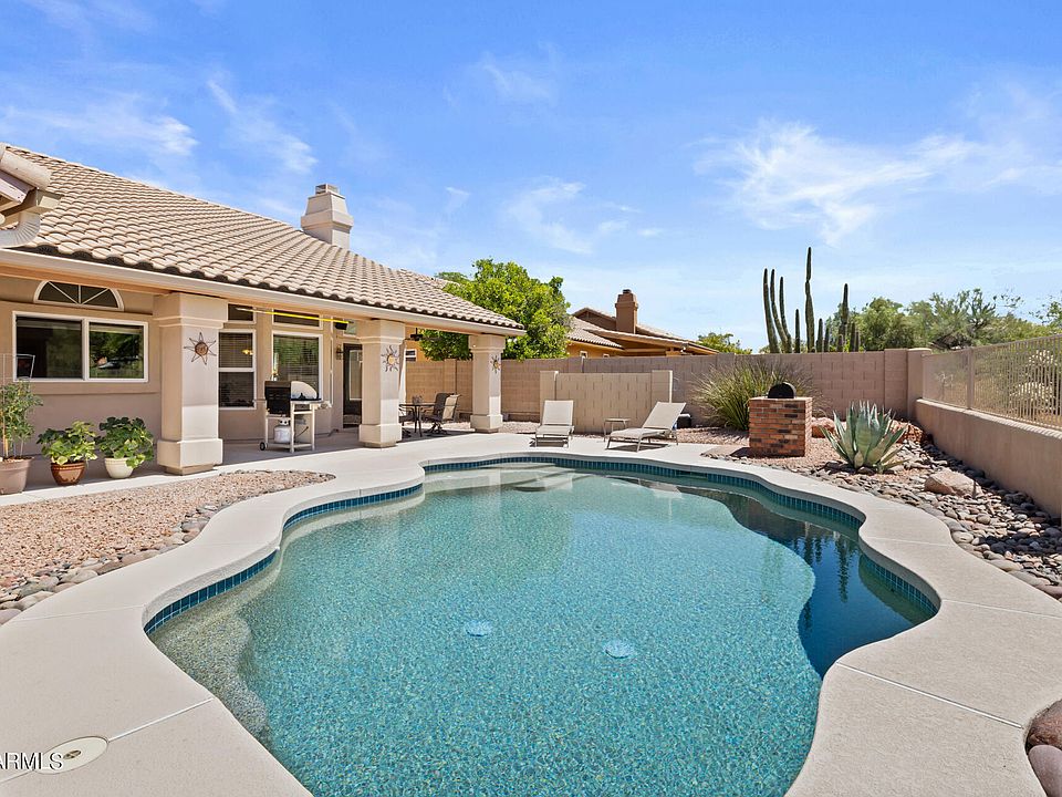 IMMACULATELY maintained home that sits on a premium lot backing to a wash for added privacy. Pride of ownership is evident from the minute you walk through the front door. Vaulted ceilings, large windows & beautiful wood-look plank flooring are only a few of this lovely home's features. The kitchen offers granite counters, black appliances, walk in pantry, ample storage w/pull outs & opens to the family room that has a cozy wood burning fireplace for those chilly AZ winters. Large primary suite w/private exit to back patio & ensuite bath that has dual vanity, walk in shower, soaking tub & private toilet. Two additional bedrooms & Den that could be easily converted to 4th. Relax in the private backyard w/sparkling pebble tec pool or under the covered patio w/fan. 3 car garage w/storage.