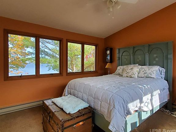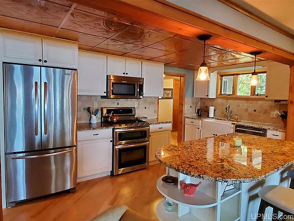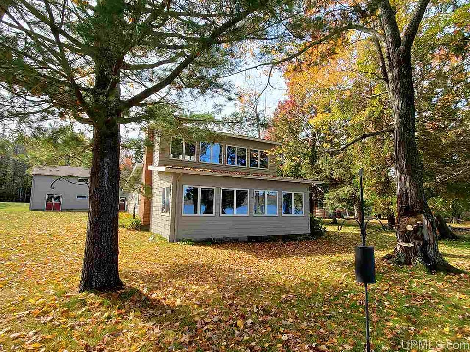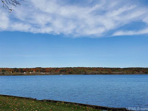 Live the lake life. Beautifully updated 2-bedroom, 2-bath home on 191' of Portage Lake in with one of the most coveted addresses in the area & Half Moon Beach Rd. The main floor has an open concept and a wall of windows to capture lake views. Kitchen, dining area, and spacious living room all open to each other. Enjoy a fire in the gas fireplace in the living room while preparing and eating meals. Kitchen features granite countertops, stainless appliances, 'copper' ceiling, and farm sink. Main floor also has a private bedroom, bath, with full-sized stackable washer & dryer. Upstairs is a master bedroom suite that takes advantage of gorgeous lake views. The detached garage fits 5 cars and has a finished office. Upstairs in the garage is storage! The property is 0.87 acre and has lovely gardens and tranquil spots to sit and contemplate life on the lake. There is an in-ground sprinkler system, a pond, a heated she-shed with loft and Dutch door, a boat house, and a removable dock.