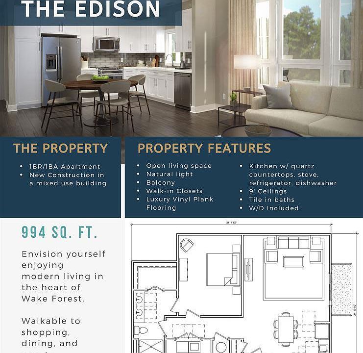 1BR/1BA The Edison: MOVE IN SPECIAL - December and January Move-In Special, $500 OFF First Full Month's Rent & only a $500 SECURITY DEPOSIT! BRAND NEW apartment with elevator access. This apartment boasts an open living space, 9-foot ceilings, tons of natural light, modern fixtures and finishes with Luxury Vinyl Tile Plank flooring throughout, large walk-in closet, and a balcony! Kitchen with quartz countertops, tile backsplash and stainless steel appliances.