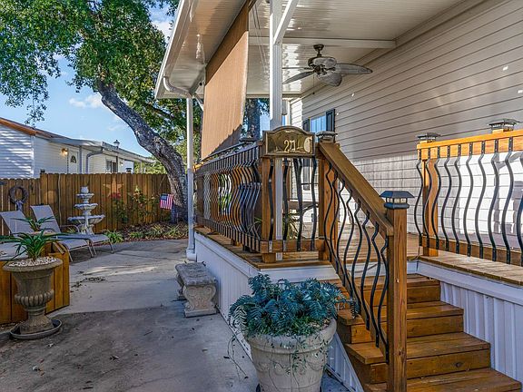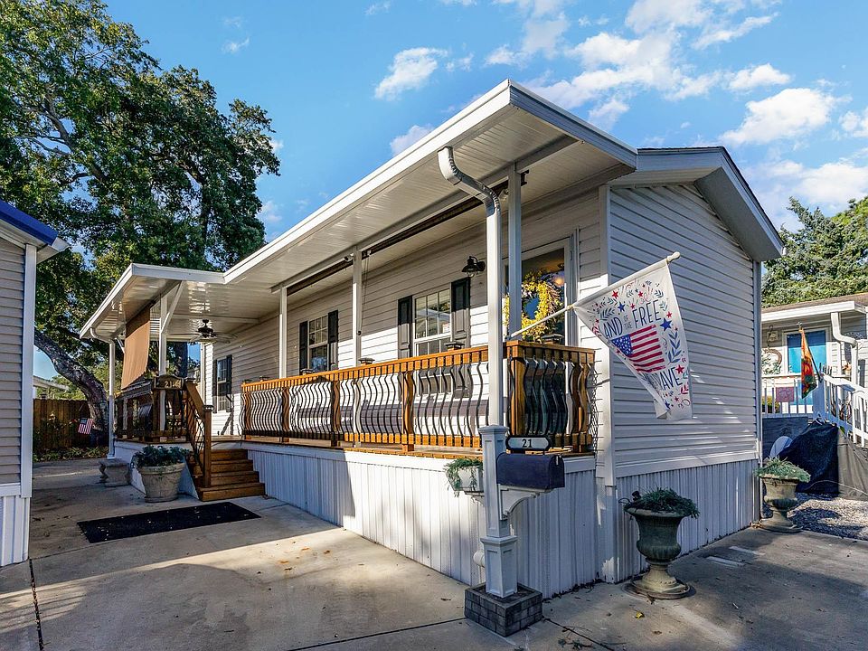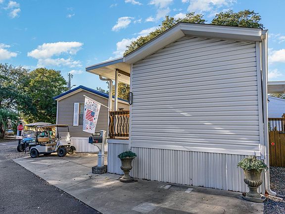 Adorable beach retreat! Within walking distance to the beach - 1 & 1/2 blocks! The exterior features an ornate Southern style front porch with an outdoor ceiling fan, sun shades and large sitting area perfect for entertaining or relaxing after a day at the beach. But don't stop there - just remodeled in 2015 with waterproof vinyl flooring throughout, new carpeting in the bedroom, ceramic tile in the bathroom, floor to ceiling ceramic tile in the shower with all glass doors, all new light fixtures, 3" crown molding and baseboards, HVAC system and water heater, privacy film on all the windows, steel front and back doors, security system, covered back porch with the same ornate railings, concrete driveway with sitting area, underground sprinkler and outside drainage system. This home also features a separate dining area, large laundry space, landscaped flower beds, two outside storage sheds and ambient lighting on the patio. This is a must see! Schedule your showing today! (Home is on leased land, no rentals of any kind allowed)