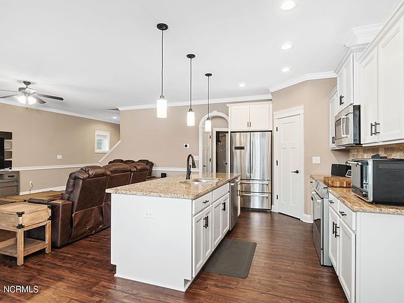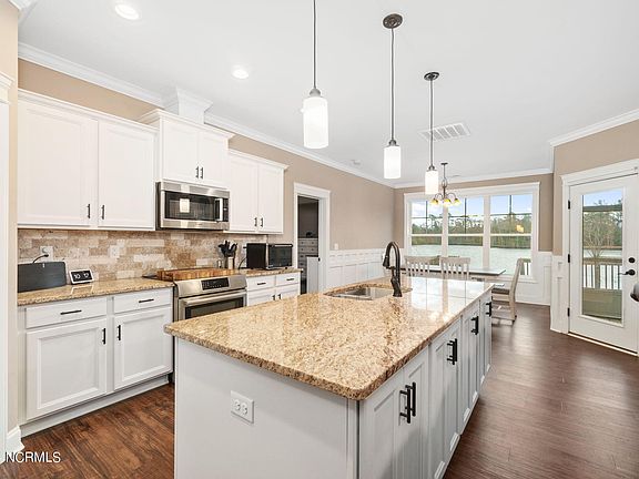 At 414 Antioch Lakes Rd, find your sanctuary, with this charming 3-bedroom, 2.5-bathroom home, which includes two versatile bonus rooms. This residence combines modern comforts with the serene allure of waterfront living, offering a space that feels both elegant and welcoming. The heart of the home is its spacious living area, complete with tasteful wainscoting and trey ceilings that adds a touch of sophistication. The kitchen is a highlight, featuring granite countertops, a central island ideal for socializing, and high-quality Bosch stainless steel appliances that cater to any culinary enthusiast. The primary suite, conveniently situated on the first floor, is designed for relaxation. It includes trey ceilings, a generous walk-in closet, and an ensuite bathroom with both a tub and walk in shower, providing a private escape at the end of the day. Upstairs, two additional bedrooms offer comfort and natural light, alongside a full bathroom. The two bonus rooms present endless possibilities, from extra sleeping quarters to a media room equipped with built-in surround sound, adapting effortlessly to your lifestyle needs. Outdoor living is a breeze with a screened room for enjoying the outdoors, and a back deck that leads to your own floating dock. This setup is perfect for water activities like paddle boarding and kayaking, or simply enjoying the peaceful water views. It's a lifestyle choice for those seeking a balance of comfort and adventure. With thoughtful features like tinted windows for maintaining a cool interior and a layout that supports both entertaining and private moments, this home is ready to be your lakeside retreat. Call us today for your private showing.