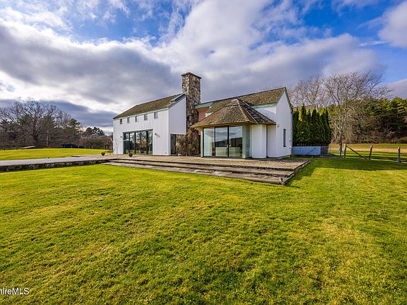 Gentle meadows and Brewer Brook create a tranquil private setting for this architect designed modern masterpiece The integration of the indoors with the outdoors is beautifully executed and the sight lines throughout are superb. A magnificent two-story living/dining room with massive fieldstone fireplace is at the heart of this home and opens to pool/jacuzzi terrace and the view. A glass enclosed gallery runs the length of the house on the other side. Well designed Kitchen with a large marble island. A gracious primary suite & two guest bedrooms on the main level. A mahogany staircase leads to a studio space, perfect for home office or additional guest space. The 16 acres is surrounded by protected woodlands, has fruit trees and is ample enough to add guest house, tennis court ,etc