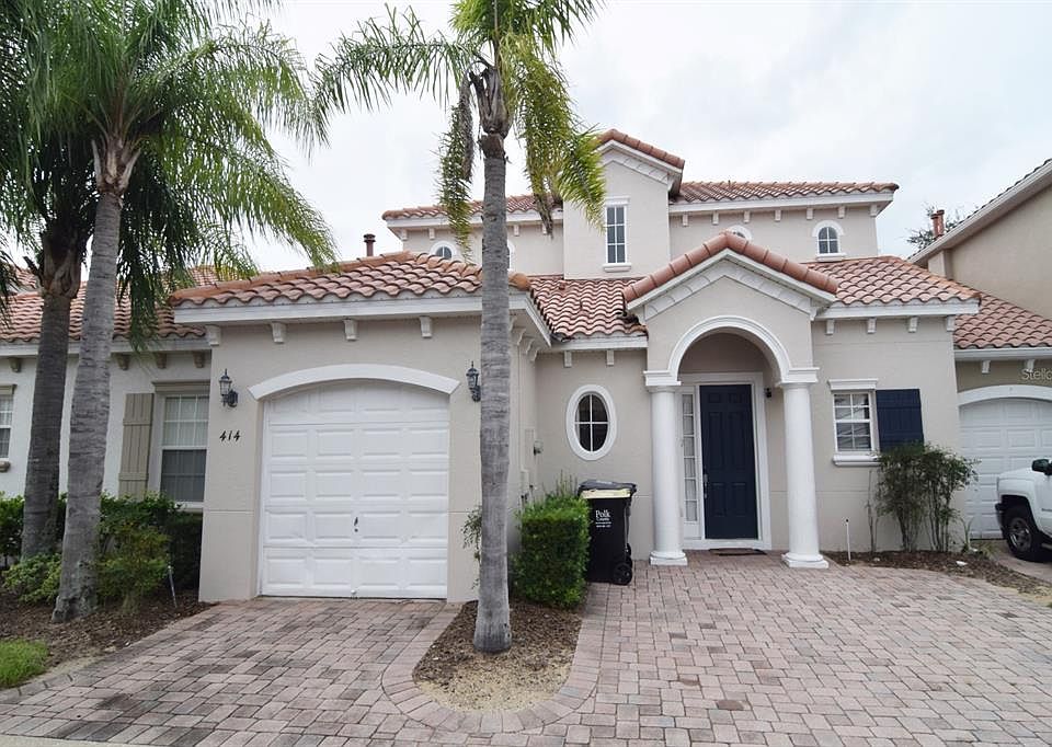 Spacious 4-bedroom, 3.5 bathroom Tuscan Hills townhome with west-facing private pool, garage and double driveway. Repainted internally September 2024 with the exterior repainted by the HOA February 2024. This spacious home offers an open-plan layout with sliding doors leading from the living area out to the west-facing screened-in pool deck. The well-proportioned kitchen has a breakfast bar and stainless-steel appliances (new fridge freezer 2023) and is located next to the dining area with door to the pool deck. There is a primary king-sized suite on the main floor with queen bed, ceiling fan and sliding doors to the pool deck, walk-in closet and en suite bathroom with twin sinks and shower. There is also a half bathroom on the main floor, laundry closet with washer/dryer and access to the garage with garage door opener. Head upstairs to the second king-sized primary suite with queen bed, ceiling fan, walk-in closet and en suite bathroom with corner tub, separate shower and twin sinks. Bedrooms 3 and 4 each have a bunk bed and closet. The family bathroom is located next to bedrooms 3 and 4 with a bath/shower. The private west-facing pool (new pool pump 2024) has a shaded area for dining, ample space out on the deck for sunbathing and a pool safety fence. Tuscan Hills is a popular residential and short-term rental community with great amenities including a gym, games room, volleyball, play area, tennis court and gated entrance - plus a great location just 10 miles from Disney World! The home comes As Is with the existing furnishings and will make an ideal vacation home, an investment property for short-term rentals or a forever home for long-term residents.