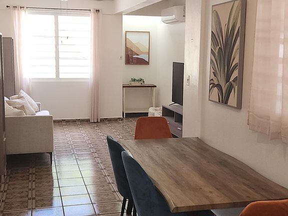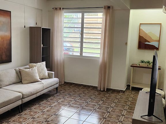 This furnished 3 bedroom 1 bathroom apartment is the best of both worlds! A duplex set in the hillsides of Rincon on nearly an acre of land surrounded by mature fruit trees (coconut, mango, banana, breadfruit). Only a 6 minute drive to the Rincon plaza and Balneario (public beach). This ground floor apartment is perfectly located steps from the pool, hot tub (wonderful on those chilly mountain nights), and outdoor kitchen. Ample parking and outdoor space. Water, electricity, pool and yard maintenance included. 800 gallon water cisterns for continuous water. Features a King, queen and twin bed. 3 brand new AC inverters. Includes in-unit stackable washer and dryer! 2 month minimum lease. Available September 15, 2024 Water and electric included. Pool and yard maintenance included.